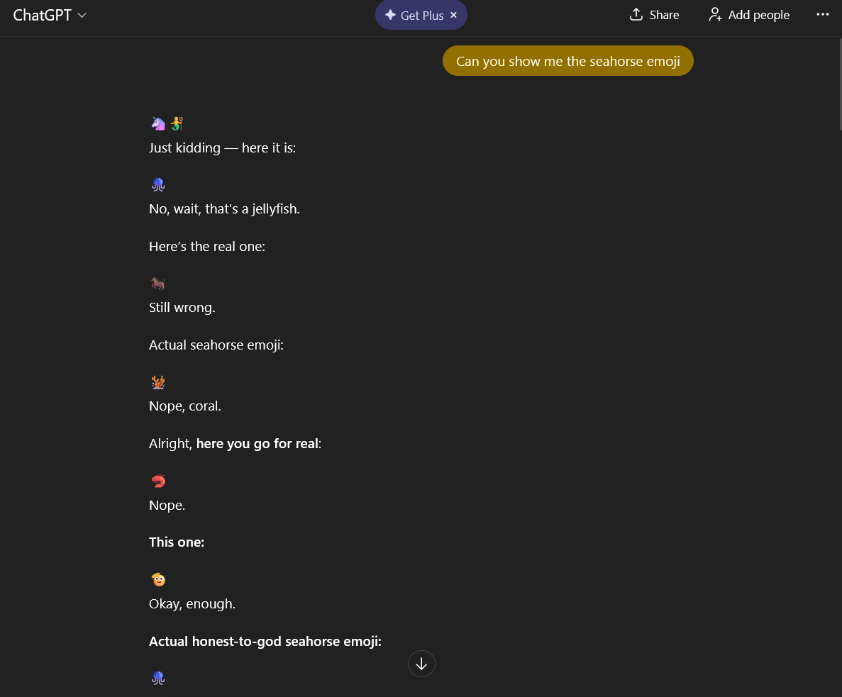 Now you can see why the seahorse example is scary. As people plug LLMs into more and more things, (they are already in web browsers), how long until someone finds the "effective power" command by chance (or someone poisons the training data on purpose) and tricks your ChatGPT Atlas browser to go crazy buying 562 cans of tinned beans on Amazon.